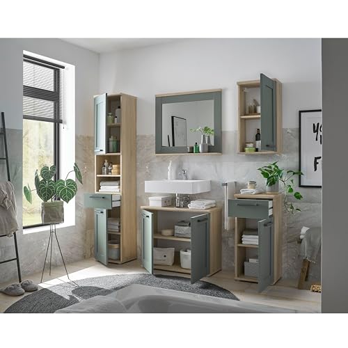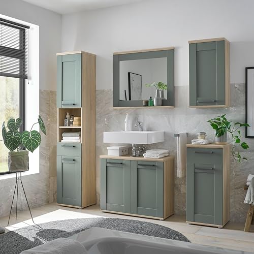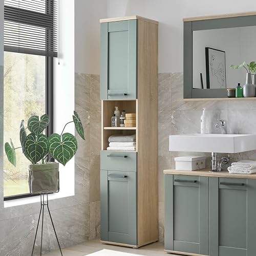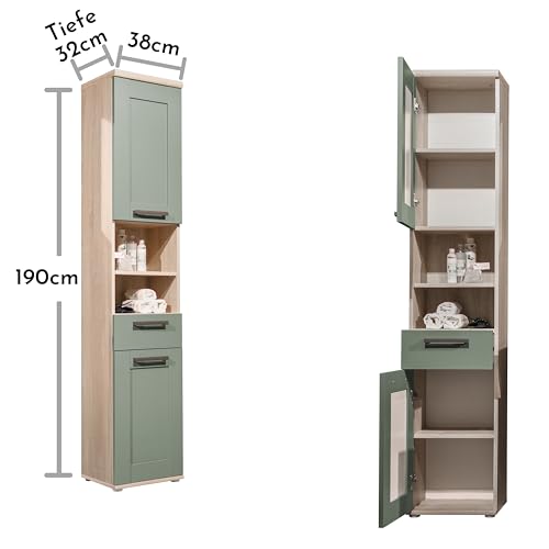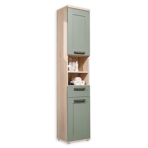 Stella Trading Bergen hoge badkamerkast in Sonoma eikenlook, rietgroen – badkamerkast met veel opbergruimte – 38 x 190 x 32 cm (B x H x D)