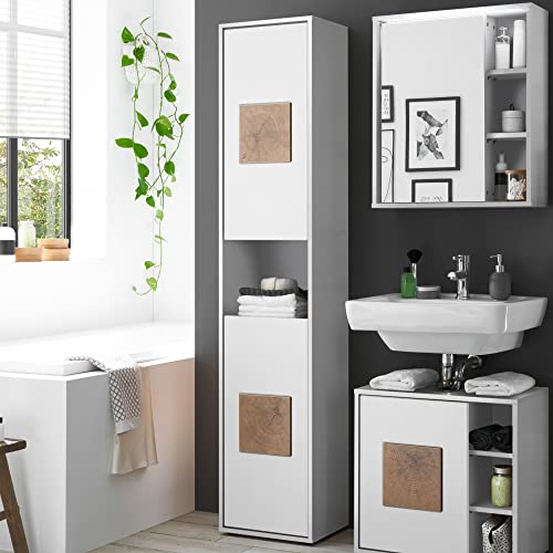 GREECE Hoge badkamerkast in wit met hersenhouten applicaties, badkamerkast met veel opbergruimte, 40 x 190 x 30 cm (b x h x d)