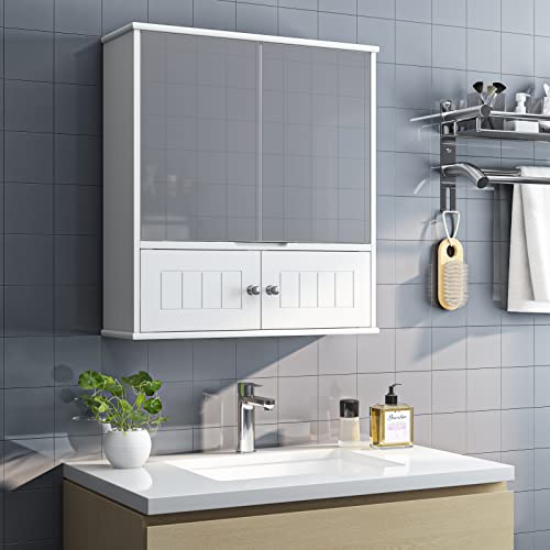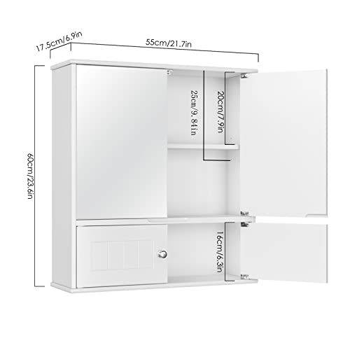 HOCSOK Spiegelkast, badkamerkast met spiegel, hangkast met 2 spiegeldeuren en 2 houten deuren, verstelbare plank, voor badkamer, doucheruimte, wit, 60 x 17,5 x 55 cm