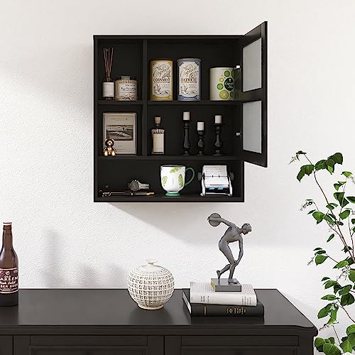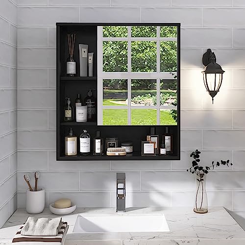 SMIBUY Badkamer spiegelkast wandmontage, bamboe ruimtebesparend medicijnkastje, wandhangend over toilet opbergkast met spiegeldeur en verstelbare plank (zwart)