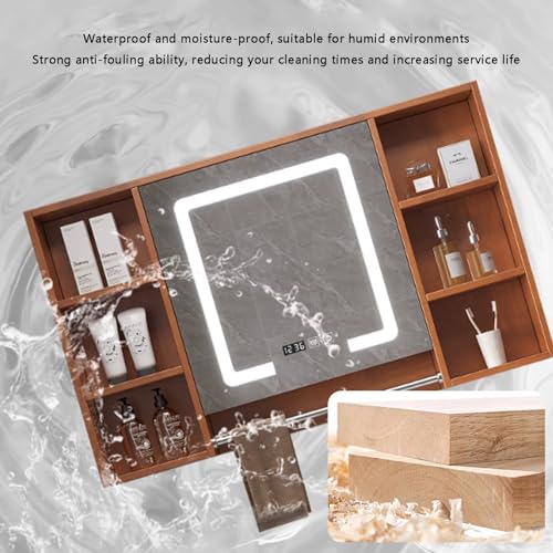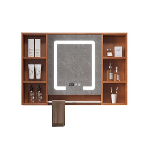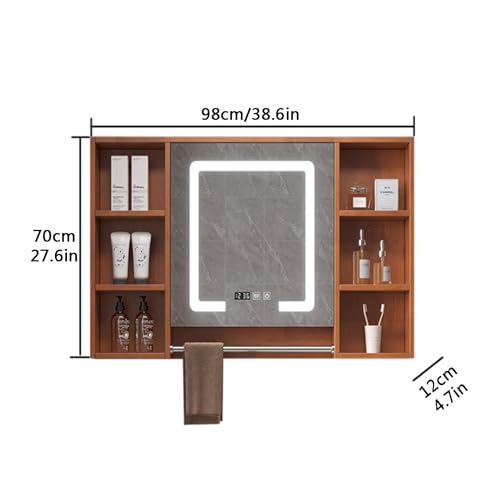 Solid wood smart medicine cabinet with mirror and lights,bathroom mirror with storage wall mounted,bathroom vanity mirror with defogger,led mirror medicine cabinet with towel rack,time display(Size:98