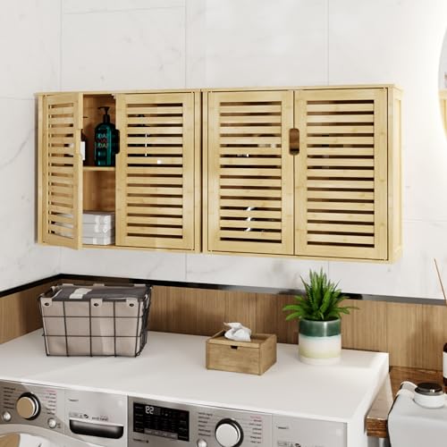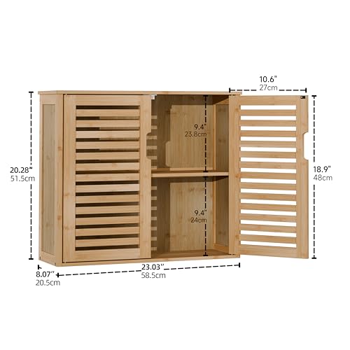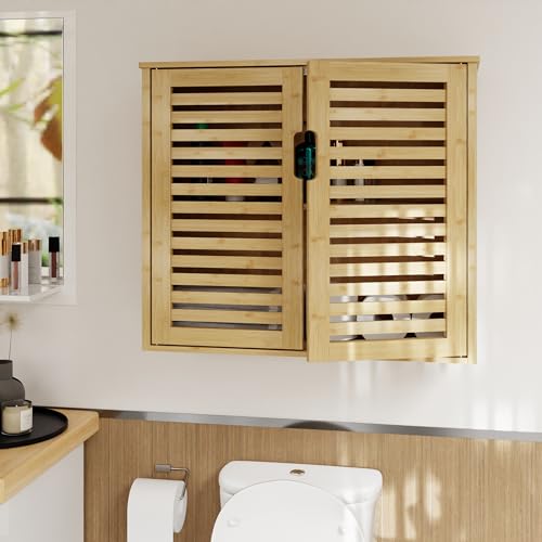 HITNET Badkamer Wandkast, Bamboe Opbergmeubel Boven Toilet, Ruimtebesparend Medicijnkastje met Dubbele Deuren en Verstelbare Planken, Natuurlijk