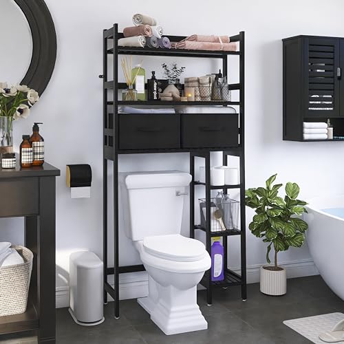SMIBUY Badkamer Opbergrek met Lade, Bamboe Over-Te-Toilet Opbergrek, Vrijstaande Toilet Ruimtebespaarder met 3-Tier Verstelbare Planken (Zwart)