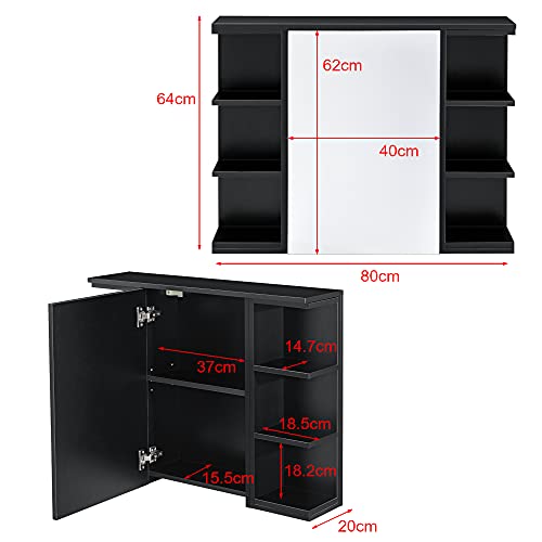 Afmetingen: – Totaal (HxBxD): 64x80x20 cm – Spiegel (HxB): 62×40 cm – Zijplanken (HxBxD): 18,2×18,5×14,7 cm – Binnenplank (BxD): 37×15,5 cm