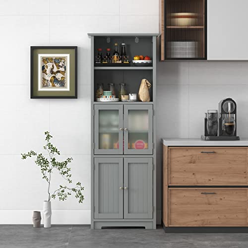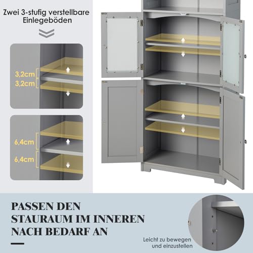 COSTWAY Badkamerkast met glazen deuren, 2 open vakken en verstelbare planken, badkamerkast, hoge kast, hout, opbergkast voor badkamer, keuken, woonkamer (grijs)