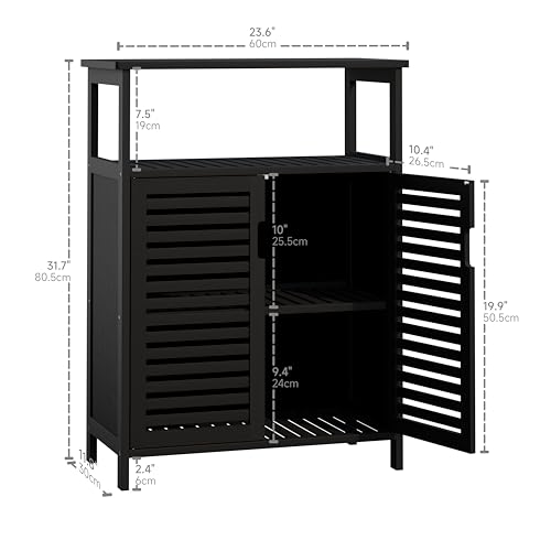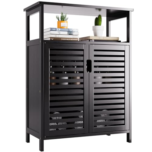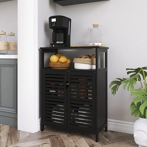 HITNET Badkamer Vloerkast, Vrijstaande Side Opbergkast, Kleine Keuken Pantry Kast Bamboe met 2 Deuren en Open Planchet, Zwart