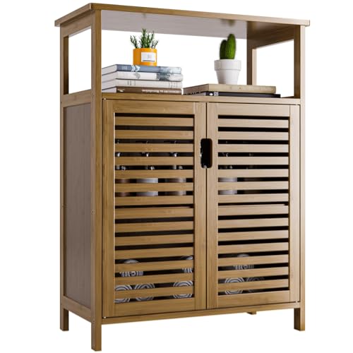 GROTE CAPACITEIT VLOERKAST- Met een breed tafelblad, een open plank en 2 vaste binnenplanken met luikdeuren biedt dit bamboe badkamermeubel voldoende ruimte om u te helpen rommel te elimineren en uw spullen te ordenen. Boven- en onderzijde open planken voor het uitstallen van decoratieve of veelgebruikte voorwerpen die u gemakkelijk toegankelijk wilt hebben. Op de 2 binnenplanken achter de sleufdeuren kunt u handdoeken, toiletpapier en andere badbenodigdheden opbergen
