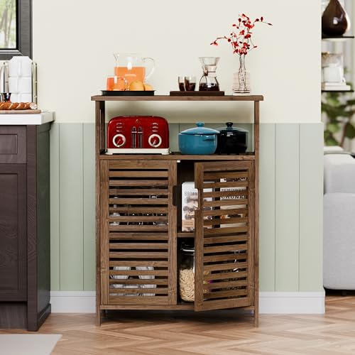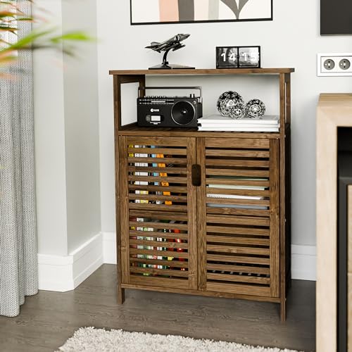 LOUVREDEUREN EN VERHOOGDE POTEN- Ontworpen met 2 latten deuren, helpt onze vrijstaande vloerkast om verborgen items te ventileren om te voorkomen dat ze gaan stinken en stof verzamelen. De uitgesneden handgrepen met magnetische bevestiging zijn gemakkelijk te openen en te sluiten. De verhoogde poten helpen ook om vuil en water van de vloer te houden