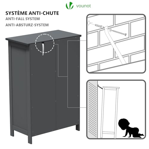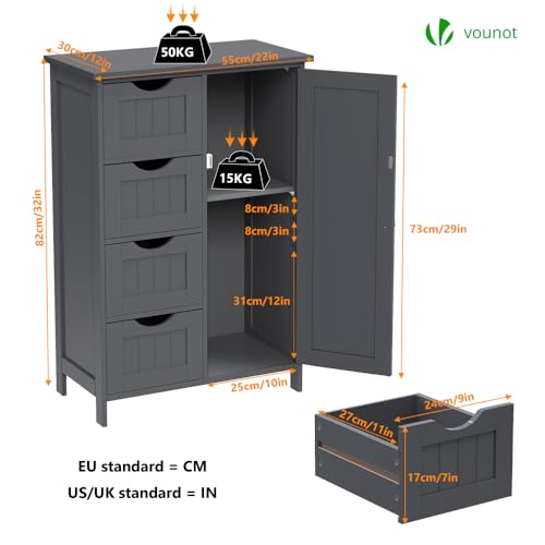 VOUNOT Badkamermeubel, badkamermeubel, zijkast met 4 laden, kastdeur & verstelbare planken voor badkamer woonkamer keuken slaapkamer 30x55x82cm Grijs